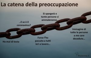 La preoccupazione ci può sembrare come una catena di pensieri o immagini, che può crescere in direzioni sempre più catastrofiche ed improbabili. Alcune persone avvertono la preoccupazione come incontrollabile – sembra assumere una vita propria. In queste settimane credo che ognuno di noi si sia trovato a pensare agli scenari peggiori. La preoccupazione ha la capacità di intensificarsi rapidamente anche da qualcosa di relativamente minore. Un esempio